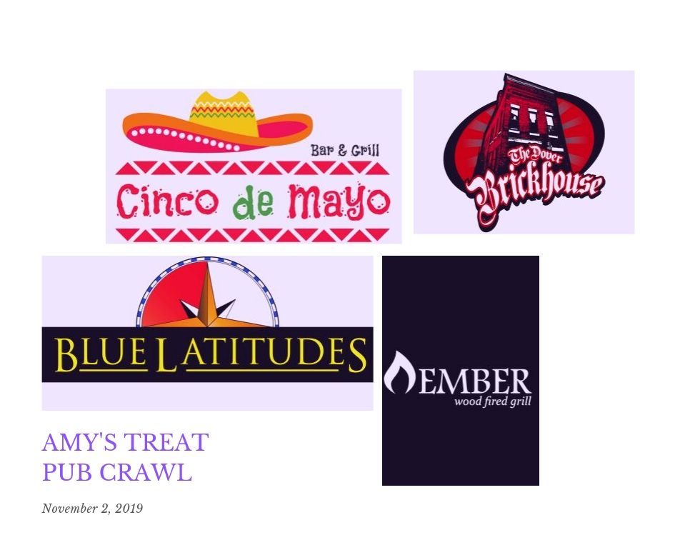We look forward to a fun, safe bar crawl. Please arrange a designated driver, Lyft, Cab or Uber to make sure everyone gets home safely. Thank you again for your support of Amy’s Treat!